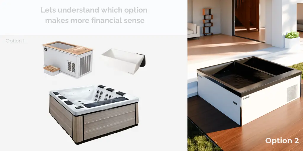 The Aquavoss Model 2 makes 100% financial sense for customers that are looking to purchase a hot tub and cold plunge  as a part of their at home wellness package. The two options we will explore assumes you are looking for a quality set-up. There of course are cheaper ways of getting a hot tub and cold plunge set-up (e.g. inflatable cold plunge, ice bags, inflatable hot tub, cheap Costco hot tub, etc.), however you would be significantly sacrificing quality by doing so.