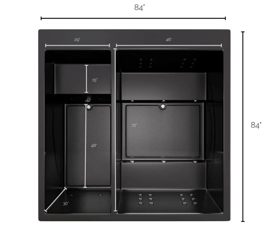 • Plunge Cold Plunge Tank (exterior chiller): 73″ L x 32.5″ W